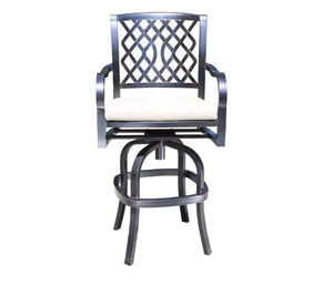 Crafted from durable aluminum, it features a stylized lattice pattern, and includes Sunbrella® cushions come in your choice of fabric. The Sunbrella® Cushions are overstuffed for comfort and support, and are designed to withstand sun damage, mold, mildew and stains.