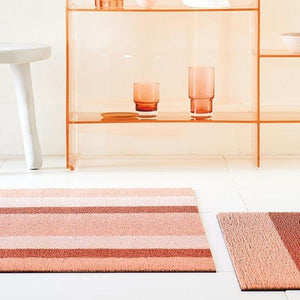 Long lasting, easy to clean, and suited for both indoors and out, this Chilewich Bold Stripe Shag Mat in Peach is ideal for use in the entryway, deck, kitchen, mudroom, patio, or pool area!
