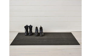 Long lasting, easy to clean, and suited for both indoors and out, this Chilewich Skinny Stripe Shag Mat in Steel is ideal for use in the entryway, kitchen, mudroom, patio, or pool area!