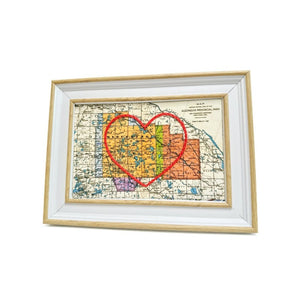 This vintage Algonquin Park map print has been hand-embroidered with a red heart that symbolizes the places, people, and adventures you hold dear.