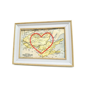 This vintage Prince Edward County map print has been hand-embroidered with a red heart that symbolizes the places, people, and adventures you hold dear.