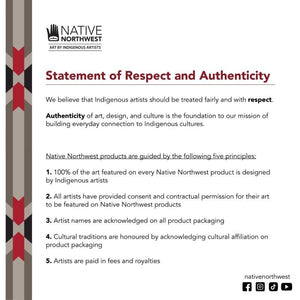 100% of the art featured on every Native Northwest product is designed by Indigenous artists. Artists are paid in fees and royalties and have their names acknowledged on all product packaging.