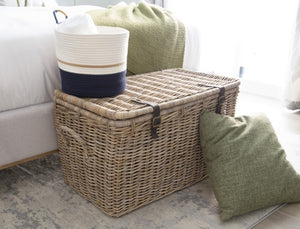 These Round White & Navy Baskets are perfect for storage where you can see it. Well sized for holding scarves, and hats at the front door, toys in the playroom, or extra hand towels in the guest bathroom, these simple baskets add style to any space.