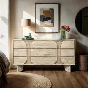This Dresser a masterpiece of craftsmanship made from solid acacia and MDF acacia veneer, finished with a brushed texture. This elegant dresser features six drawers with normal runners and a unique hidden catch handle system that seamlessly integrates into the design.