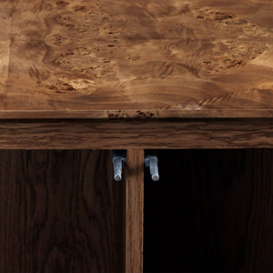 Other Details: Exterior Product: Mappa Burl Veneer; Inside Doors: Oak Veneer; Doors: Push and Pull System; Removable Legs: No; Finished Back: Yes (same finish as inside cabinets); Wood Joinery: Glue, Nails, Dowel Butt Joints