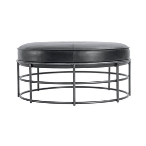 Round and versatile, this low-profile ottoman mixes smooth faux leather with subtle stitching for a clean, casual finish.