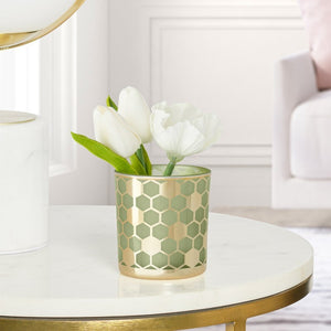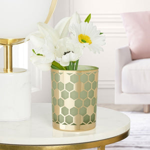 Whether used as a small vase or as a tealight holder, this glass hurricane will standout in any space. The light green glass pairs perfectly with the gold honeycomb design giving this piece a modern lux appeal.