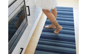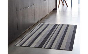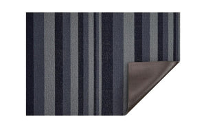 Long lasting, easy to clean, and suited for both indoors and out, this Chilewich Bounce Stripe Floor Mat in Storm is ideal for use in the entryway, kitchen, mudroom, patio, or pool area!