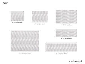 A gradation of weaves creates the soft-edged shapes of Arc. Rows of layered crescents intersect and align to form a dynamic pattern of connected curves and rich texture.