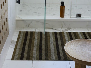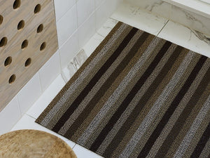 Long lasting, easy to clean, and suited for both indoors and out, this Chilewich Even Stripe Shag Mat in Mocha is ideal for use in the entryway, deck, kitchen, mudroom, patio, or pool area!