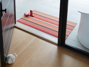 Long lasting, easy to clean, and suited for both indoors and out, this Chilewich Pop Stripe Shag Floormat in Paprika is ideal for use in the entryway, dining areas, bedrooms, living areas, and kitchen!