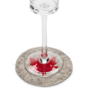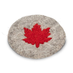 Made out of wool felt from 100% sheep wool and handcrafted by female artisans in Nepal, this grey coaster accented with a bright red maple leaf will help protect your surfaces from heat or water damage while complementing your decor at the same time. Fair trade certified.