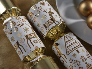 Ten handmade traditional English crackers. Each cracker contains a snap, joke, party hat, and a surprise gift. Place one at each place setting for decoration and then pull it open with a friend and share the fun!
