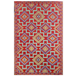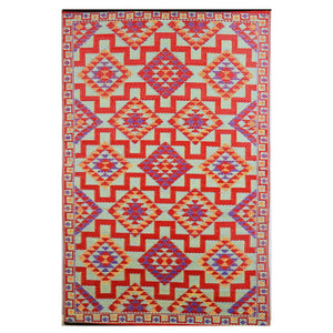 Inspired by traditional slitweave kilim rugs, the Red Kilim Outdoor Carpet mixes red, yellow and blue tones in a stunning, fully reversible pattern.