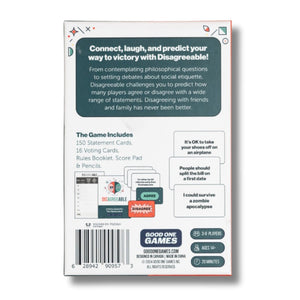 Connect, laugh, and predict your way to victory with Disagreeable! From contemplating philosophical questions to settling debates about social etiquette, Disagreeable challenges you to predict how many players agree or disagree with a wide range of statements. Disagreeing with friends and family has never been better. With 150 unique statements, the game encourages fun debates and surprising insights as you discover how well you really know each other!