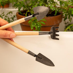 The Mini Garden Tool Set offers the perfect gardening tools for indoor or small plant gardening. Designed to take up minimal space, these tools feature a stone wash finish and beechwood handles.