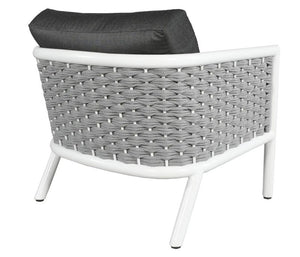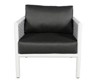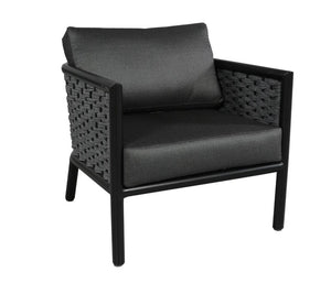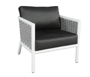 Harlow's sheltering, rounded back and neo retro angled back legs set the tone for effortless style and serenity. It combines a durable aluminum frame, deep seating cushions, and Sol Rope® details.