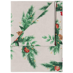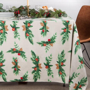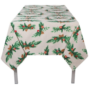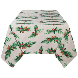 Entertain in style this holiday season with this 100% cotton Deck The Halls Tablecloth. Featuring a lovely foliage themed design on natural linen background, this tablecloth is welcoming and easy to clean.