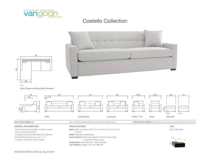 Available as a sofa, condo sofa, loveseat, chair, chair & 1/2, and sectional the Costella collection pieces are made in Canada using only top quality materials, Van Gogh Designs' upholstered furniture is built to last. With nearly 500 individual fabrics, hundreds of styles and a nearly limitless array of custom options, it is easy to create a bespoke, made-to-order showpiece without breaking the bank.