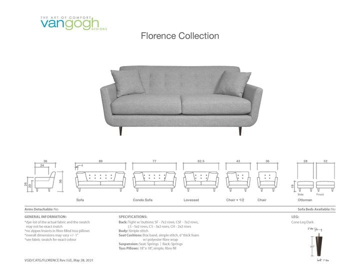 The Florence Collection pieces are made in Canada using only top quality materials, Van Gogh Designs' upholstered furniture is built to last. With nearly 500 individual fabrics, hundreds of styles and a nearly limitless array of custom options, it is easy to create a bespoke, made-to-order showpiece without breaking the bank.