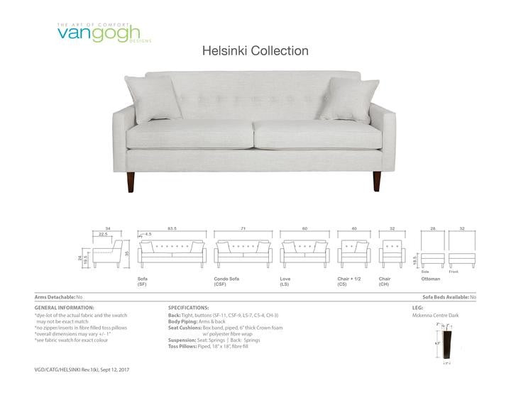 Available as a sofa, condo sofa, loveseat, chair and a half, chair, and ottoman. Made in Canada using only top quality materials, Van Gogh Designs' upholstered furniture is built to last. With nearly 500 individual fabrics, hundreds of styles and a nearly limitless array of custom options, it is easy to create a bespoke, made-to-order showpiece without breaking the bank.