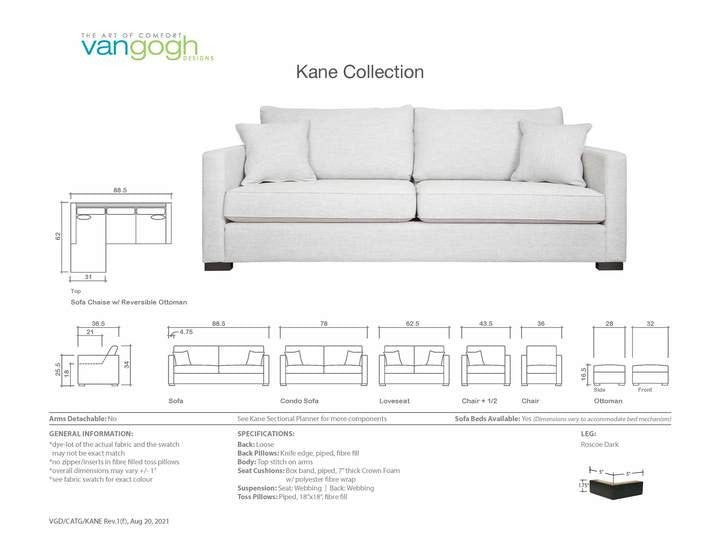 Available as a sofa, condo sofa, loveseat, chair or chair & 1/2, and sectional, the Kane Collection pieces are made in Canada using only top quality materials. Van Gogh Designs' upholstered furniture is built to last. With nearly 500 individual fabrics, hundreds of styles and a nearly limitless array of custom options, it is easy to create a bespoke, made-to-order showpiece without breaking the bank.