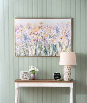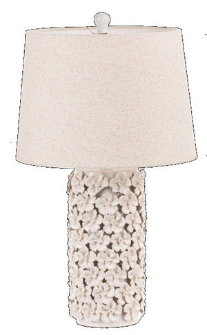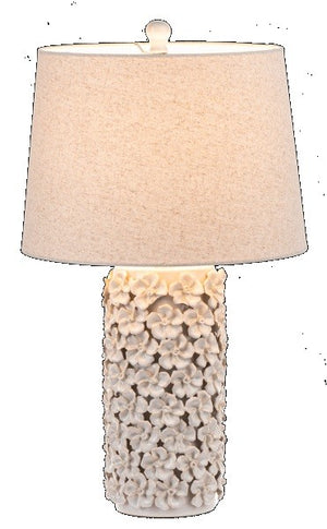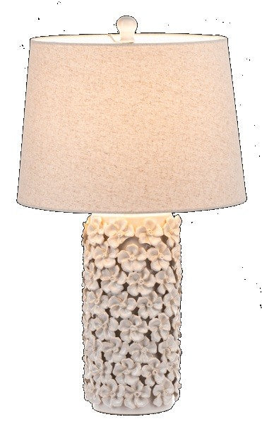 Elegant ivory table lamp with a cylindrical floral design. Provides soft, ambient lighting and accommodates bulbs up to 100W for a warm, inviting glow.
