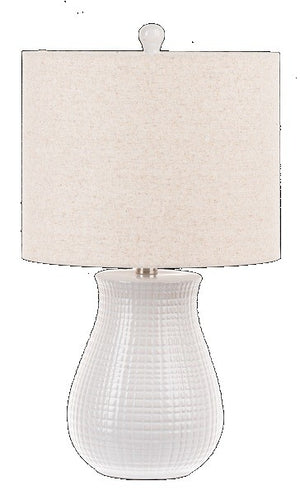 Modern white table lamp with subtle etched line detailing. Provides soft, ambient lighting and supports bulbs up to 60W for a warm, inviting glow.