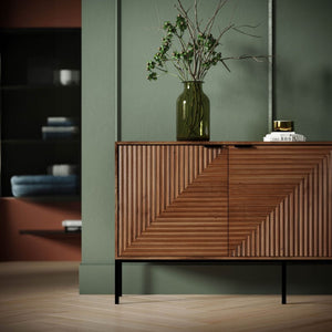 - The standout feature of this sideboard lies in its doors, adorned with an exceptional fluted pattern that seamlessly transitions from vertical to horizontal. This unique design creates a mesmerizing visual effect, turning the sideboard into a statement piece that captures the essence of both sophistication and innovation.