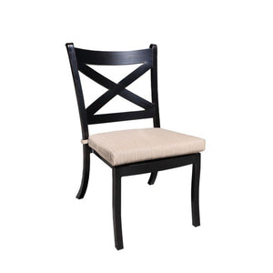 Entertain your guests in style with the Milano Outdoor Dining Side Chair. This collection calls to mind early Mediterranean pieces, with scrolled arms and open cross-backs. Made from powder coated aluminum for added durability, this dining chair was designed to withstand various weather conditions.