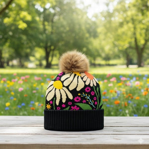 Brighten up your winter style with this black knit pom beanie, featuring a vibrant daisy floral pattern that captures the joyful essence of nature. Designed with oversized blossoms in cream, yellow, pink, and orange tones, the pattern creates a bold yet elegant contrast against the deep black base — a perfect blend of modern chic and retro charm.