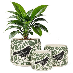 With its bold silhouette and nature-inspired design, this cement planter makes a dramatic yet grounded statement. Embossed crows and foliage offer texture and intrigue.