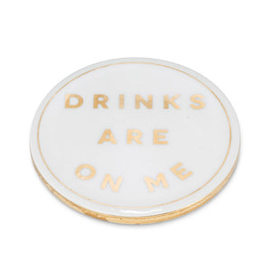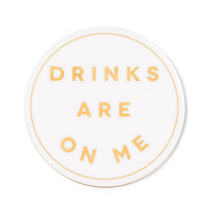 Protect your tables from difficult water rings with this fun and cheeky Drinks On Me Coaster! Made from ceramic, this coaster offers a cork bottom to prevent scratching and is ideal for everyday dining or entertaining.