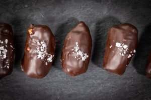 Rich, chocolatey, and irresistibly smooth. Chewy Medjool dates are filled with creamy hazelnut praline and crunchy cacao nibs, then coated in silky 85% organic fair-trade dark chocolate—made without soy or emulsifiers.
