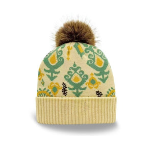 Stay warm in style with this yellow-green knit pom beanie, featuring a charming Nordic-inspired floral pattern that captures the cozy spirit of winter. The design blends traditional motifs with modern colour harmony, combining soft yellows, greens, and subtle earth tones for a naturally elegant look.