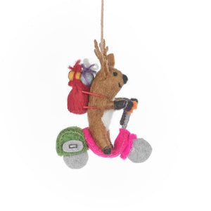 Ho, ho, hold on tight! Santa's paid off the finance on his sleigh and upgraded the rowdy reindeers to a MUCH cooler ride. Find Comet cruising through the winter wonderland on a pink Vespa, his adjustable wire antlers catching the breeze as he zips through the snow, his jolly needle felted red sack overflowing with fabulous felted presents strapped to his back, ready to spread Christmas cheer.