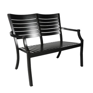 Clean, modern and streamline, the Mission Outdoor Bench is crafted from a durable cast aluminum and is available in a Black finish. Can be paired with outdoor dining tables, or used as general outdoor seating. Customizable Sunbrella® fabric cushions are available in a variety of colours and patterns.