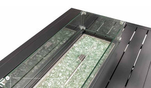 - Includes: Fire pit table, burner lid, nylon cover, burner stones, & square glass fireguard