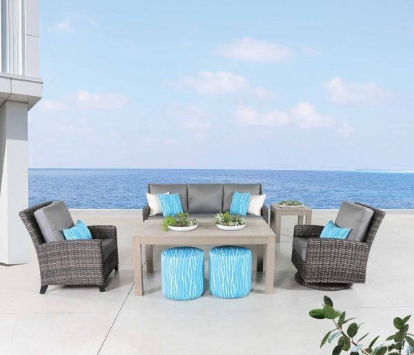 It includes customizable Sunbrella® cushions, available in a variety of patterns and colours, the cushions are overstuffed and designed to be resistant to sun damage, stains, mold, and mildew.