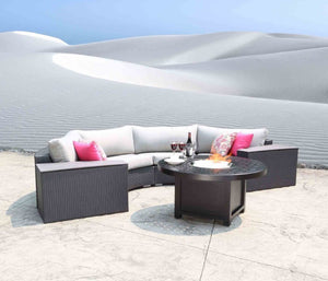 Includes cushions with thick seat pads and overstuffed back support to ensure the comfort of your guests. Cushions are customizable, with a variety of fabric and pattern options, and resistant to stains, sun damage, mold, and mildew.