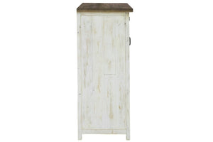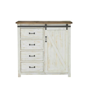 Featuring an antique white based with a natural wood, the Provence 4 Drawer Chest can easily be used in a living room, dinning room or a bedroom. Featuring ample storage room, the Provence 4 Drawer Chest comes equipped with a modern farmhouse gliding door that adds charming design to any space.