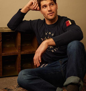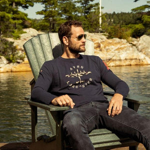 We are lucky to see the Canadian Lanc fly regularly around Toronto and were inspired to celebrate this incredible piece of Aviation History with our long sleeve cotton crew neck shirt. It features the tail colours of CGVRA on the left upper arm and comes in our Airforce Blue colour.