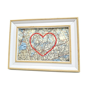 This vintage Kawartha Lakes map print has been hand-embroidered with a red heart that symbolizes the places, people, and adventures you hold dear.