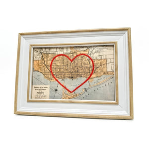 This vintage Toronto map print has been hand-embroidered with a red heart that symbolizes the places, people, and adventures you hold dear.