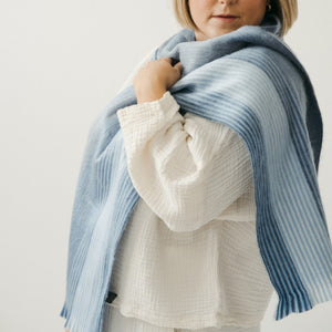 This scarf is hand-loomed, machine-woven, and then machine-brushed for added softness. This unique, artisanal scarf collection is made by a family of Indigenous artisans living in the volcanic mountains of Ecuador. The order of which the colours are woven vary from scarf to scarf, however the colours you see remain the same with each - making it a truly unique artisan gift.
