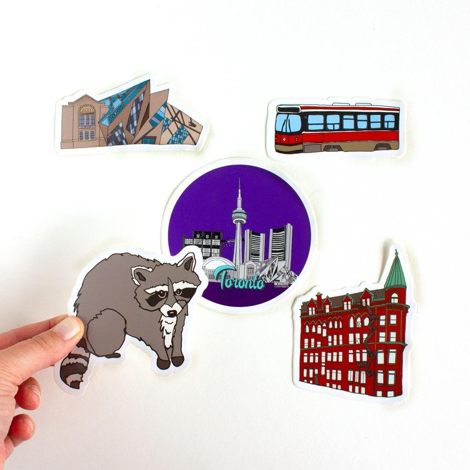 This sticker pack features 5 of Toronto's iconic landmarks. They are hand illustrated and printed on high quality waterproof vinyl. They can be applied to a variety of surfaces.