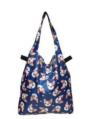 This reusable tote bag with snap closure folds into itself for compact, portable storage. It features additional straps that hooks onto the handles of a wheelchair or stroller.