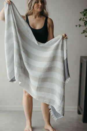 Be prepared for sunny days with this trusty, generously sized towel. Made with pure Turkish cotton, it is light-weight, easily compact and repels sand and dirt well, making it a care-free travel towel for beach days, lake side retreats or picnics in the park. Accompanied by their classic design and eyelash fringe, the Boardwalk Towel was made to accompany you on all your summer adventures and for years to come.