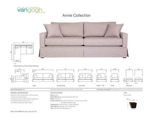 Available as a sofa, loveseat, chair, and sectional, the Annie collection pieces are made in Canada using only top quality materials, Van Gogh Designs' upholstered furniture is built to last. The Annie speaks to traditional design with eloquent simplicity. This collection provides a vintage look, with the practicality of a pleated skirt to keep the space looking seamless and sophisticated. Customers drawn to the Annie love it for its classic design.