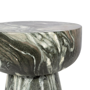 This side table, crafted from concrete with a remarkably realistic green marble hue finish.